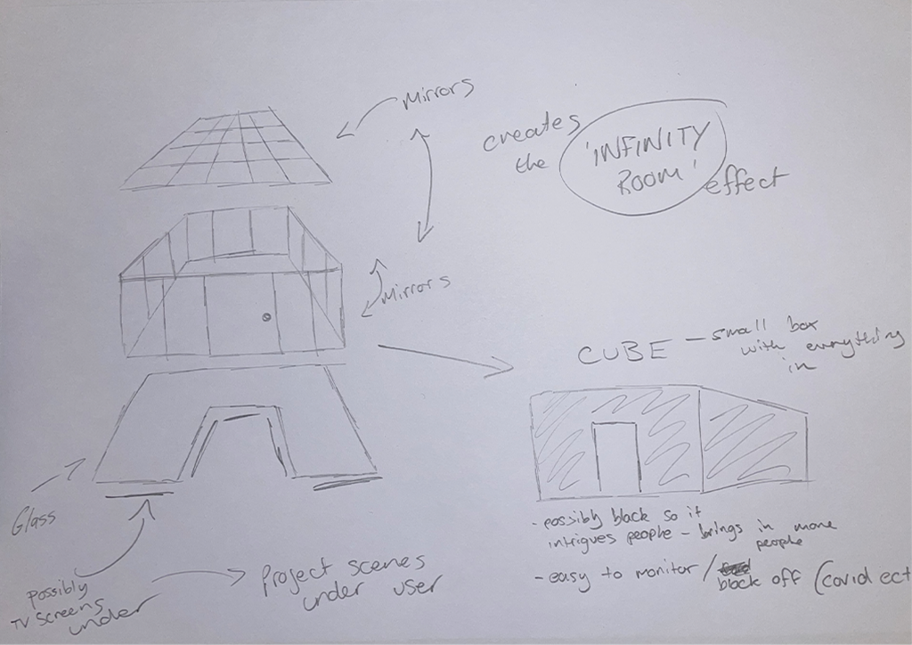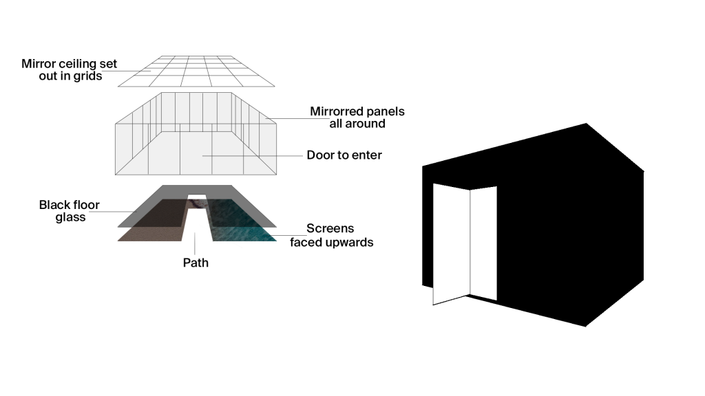 My main idea is to have a ‘infinity room’ where there would be a small box people can walk into and they will be greeted with mirrors everywhere that reflect different things for the audience to see. Within this, I was thinking a set of screens below the user (under a glass panel) would be interesting to then display different scenes such a sea and sand video that would make it seem like they’re on the beach.