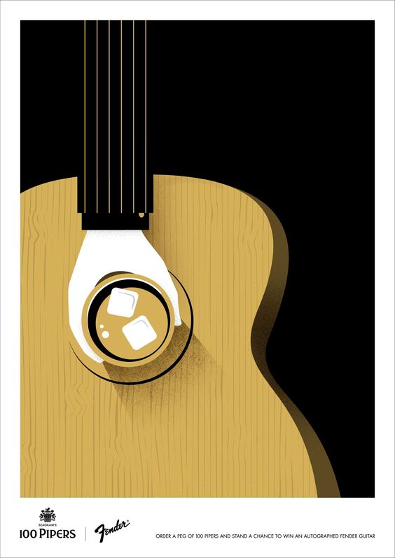 Above is three posters I have handpicked and I believe present the idea of conceptual visual design in music. Each illustration depicts two topics, one of them being music and seamlessly merges them into a complete poster, where both subjects are noticeably connected. I particularly like the 3rd design where the artist has cleverly blended a guitar into a pinstripe suit for the strings of the guitar and a hand holding a cup, specifically where the sound hole is located on an acoustic guitar. The poster was designed for Fender in association with 100 Pipers (Whisky brand) in order to convey how the brand had a very close connection with music, which therefore brought their consumers closer to them. One thing I construe from this design, is that the artist is trying to convey that music is an important part of everyday life, just like the drinks you consume throughout the day. Alternatively, some audience’s may see that whisky is for those who want to enjoy drinking while relaxing, just like they would play or listen to music when they want to wind down.