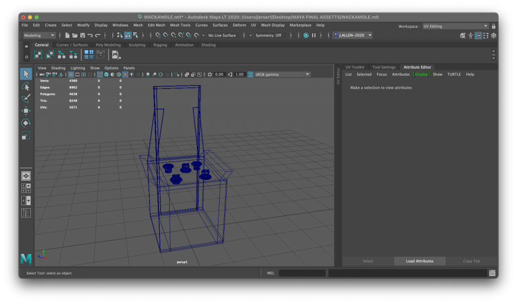 Above is the wackamole wireframe featuring the backboard and bear assets that are included in the product. I aimed to have a backboard for the screen to be placed on and have the main base for the bears to pop up from. In addition I added some diagonal sides to add some further detail to the product however I think when doing this, it impacted something else and created a small visual glitch when rotating which unfortunately is something I was unable to fix without totally recreating the machine.
