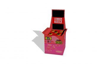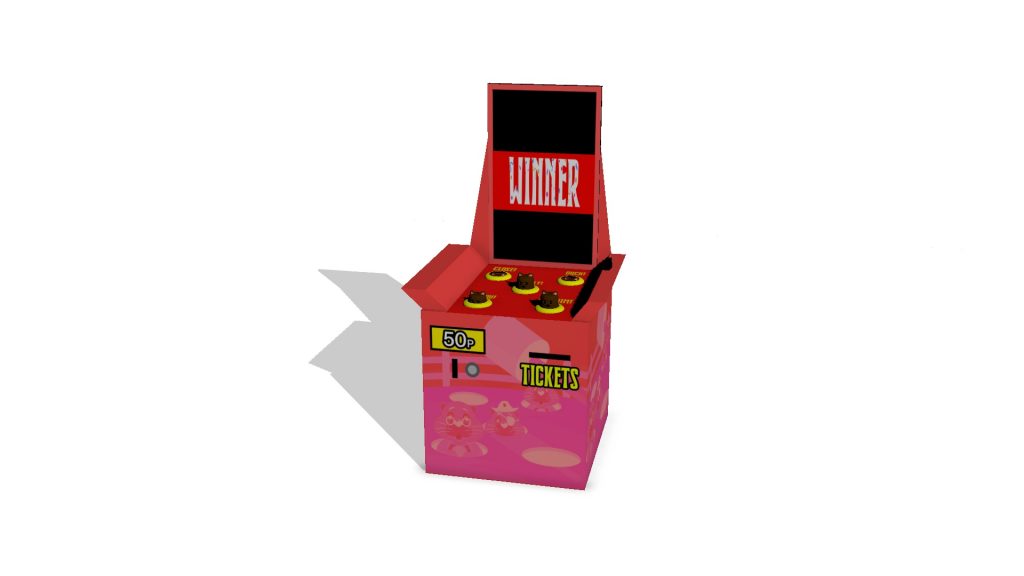 Here is the final render for the Wack-A-Mole machine. The machine features 5 bear assets popping up at different heights surrounded by yellow rings with text above. The machine also features a screen in the middle which will display a virtual version of the game with pop ups and a winner screen providing you hit a certain amount of score.