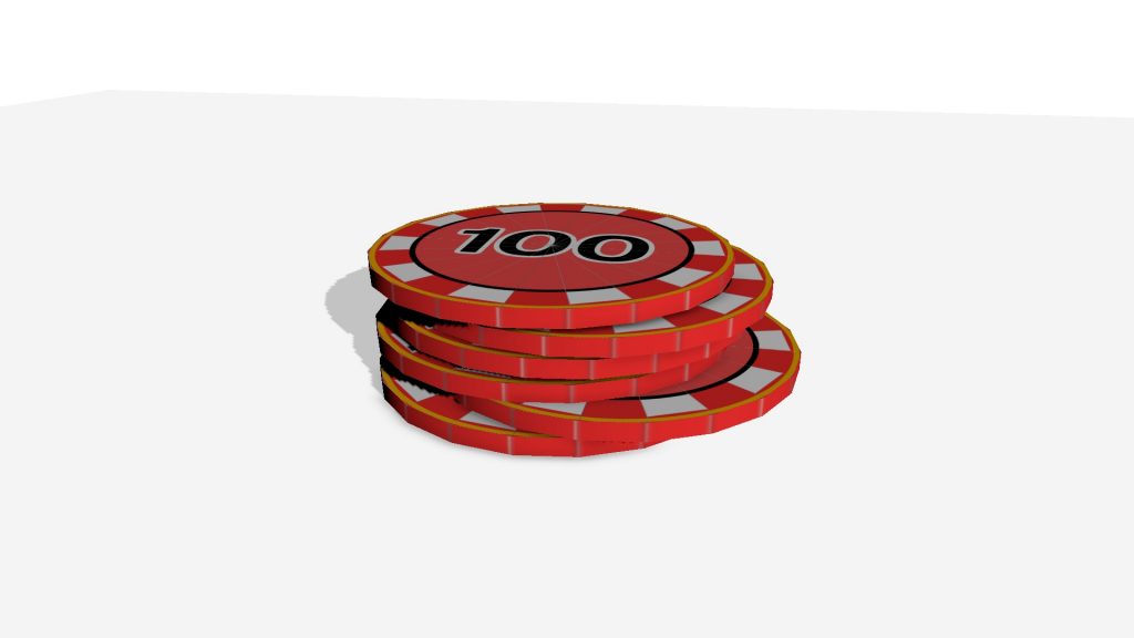 Here is the fully textured render of the casino chips. I chose to go with a red chip for these and designed the ‘100’ value myself. I use photoshop and made sure the sections where all equal and alternatively coloured like a real casino chip.