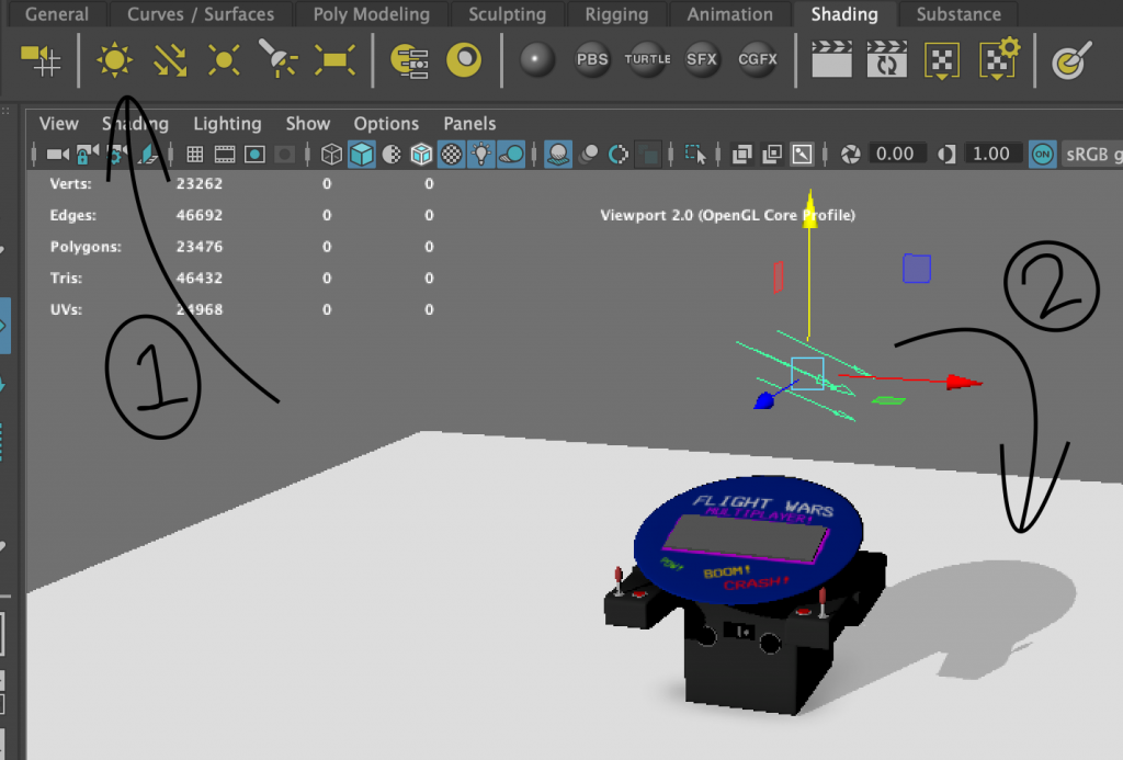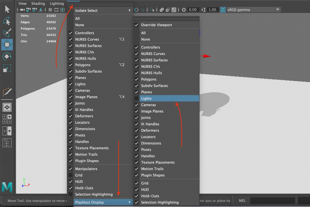 One thing that was helpful is that in the playblast display settings, I was able to hide any unnecessary icons and assets from the final image. This includes the lighting indicator, which would still project light on to the subject, but the final image would not show the directly editable source.