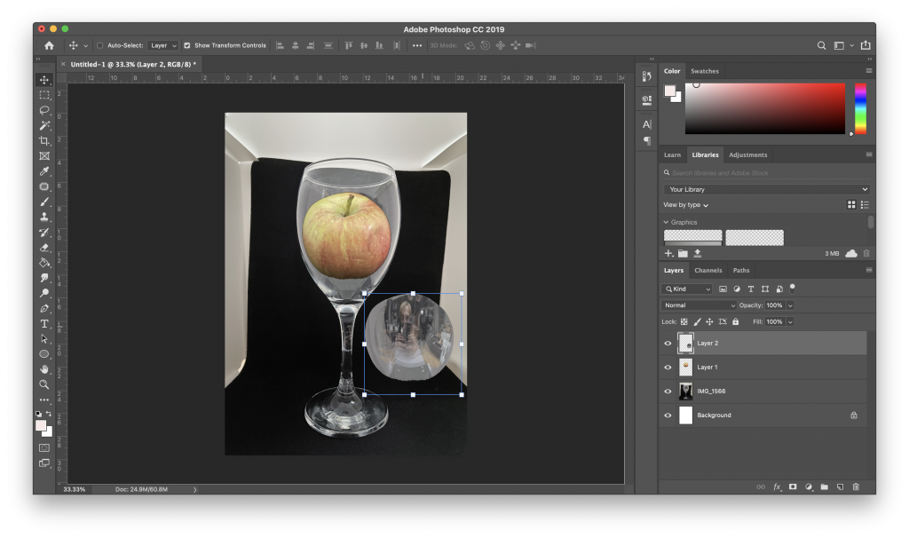 My final step is to just make some final adjustments to the glass and the apple, such as a slight opacity change and a small shadow at the bottom of the apple and then I have successfully combined these two images.