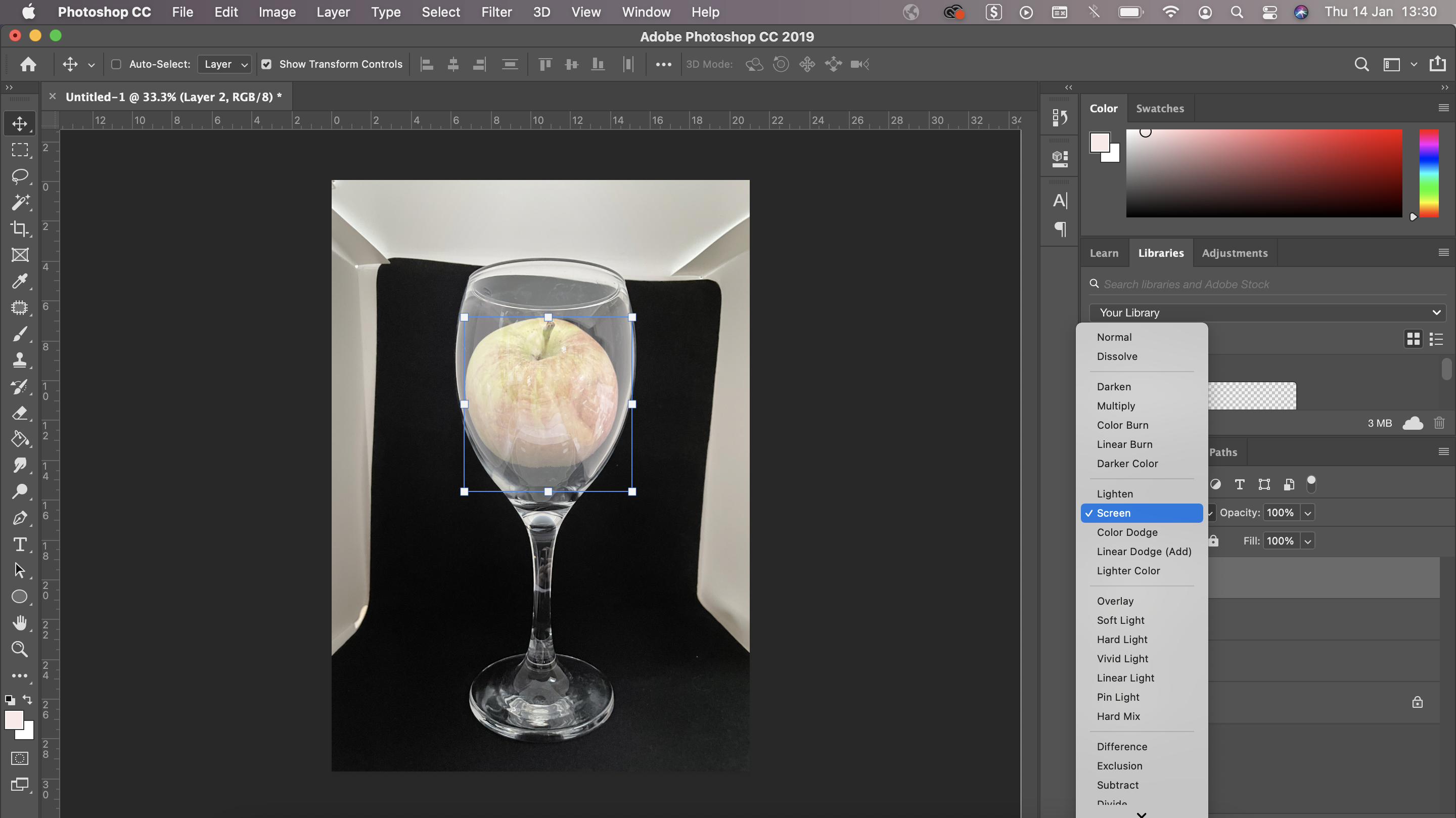 I then choose the layer style, ‘Screen’ which changes the section of glass to be more opaque and add a reflection over the apple. This also dulls down the colour of the apple to give the impression that it is actually inside the glass.