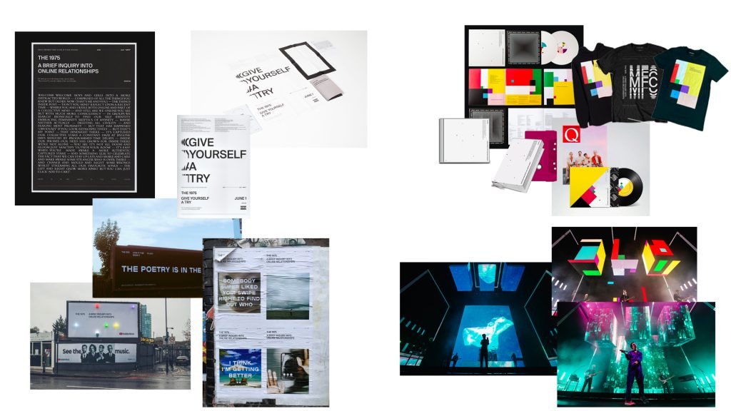 Posters and advertising campaigns are all created with the artists ideas so they match the projects aesthetic and feel. Whether this be imagery, graphics or fonts, it is often a good idea to keep everything consistent throughout the development of the project. One way of this is using the same designer, which can be seen throughout The 1975’s ‘ A Brief Inquiry Into Online Relationships album of 2018. Samuel Burgess Johnson was the lead designer throughout the graphical process, from the vinyl record packaging to the advertising boards that appeared throughout London.