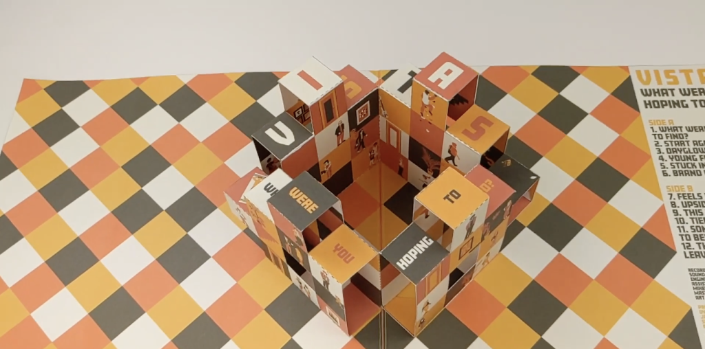 Blood Records variant of Vistas’ 2021 album ‘What Were You Hoping To Find’ displays a pop up graphic when interacted with by the user.