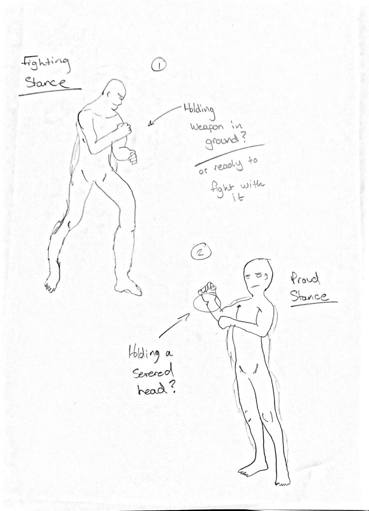 I have chosen a fighting stance as my character would be in many altercations due to his intentions. This specific stance can be interpreted in two main ways, one in which he is ready to punch someone, and the other being a position he would be in while holding his weapon in the ground (or someones body).