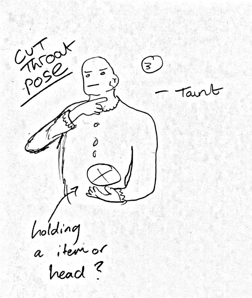 Finally, I have chosen to use a ‘cut-throat’ pose, which would most likely be used as a taunt. This involves the character imitating cutting his own throat, to infer to the challenger that he is going to kill them. Once again this is more of an aggressive but subtle pose which would come before a series of actions- such as fighting.