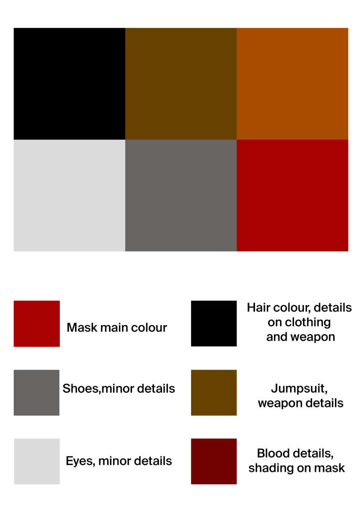 I wanted my character to take the idea of a clown outfit, and remove the bold, colourful aspect to match his personality and desire for revenge and murder. Unlike a stereotypical clown to some people, I wanted my character to be menacing and ruthless, instead of creepy and scary. This is why I have chosen brown as the jumpsuit colour as its dark but also brings in the connotations of the deer which is why he is planning his acts. In addition I have chosen his mask to be red with blood detailing to add depth to this outfit and show he is out for murder. Furthermore I have chosen other dark and less adventurous colours for additional details and clothing such as shoes and hair as these are less relevant to his outfit and are more for practicality rather than design.