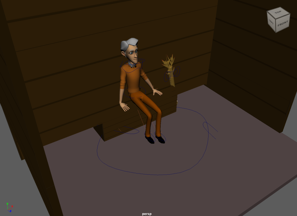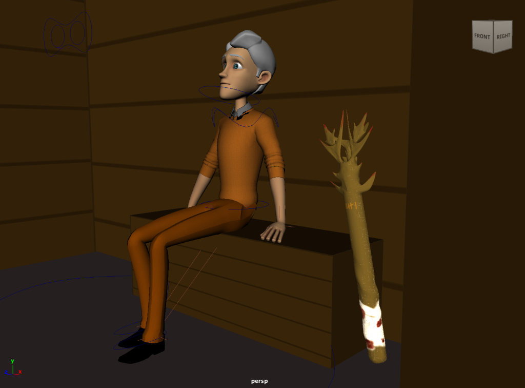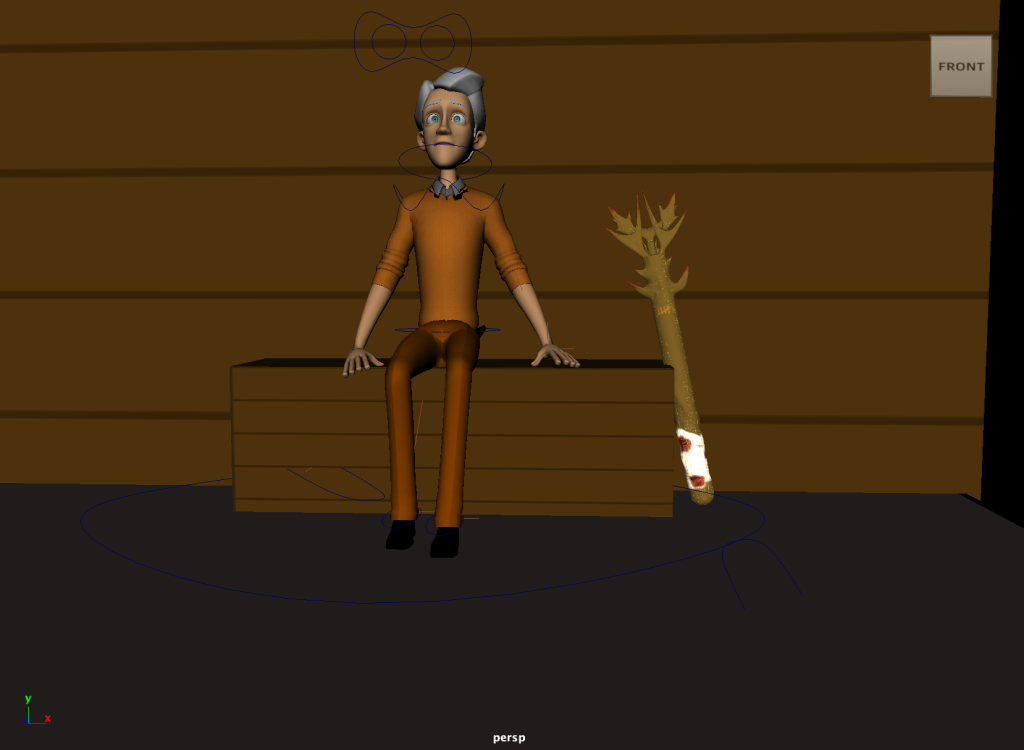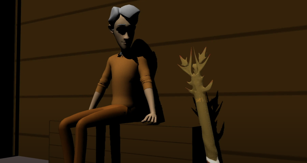 Finally, as previously mentioned I included my 3D modelled weapon which my character used as an extra asset to the scene. This is seen within the sitting sequence as well as the fight scene where it is actually held. In the sitting scene however it is propped up against the seat next to character. This adds an extra bit of character to the scene and references my previous model.