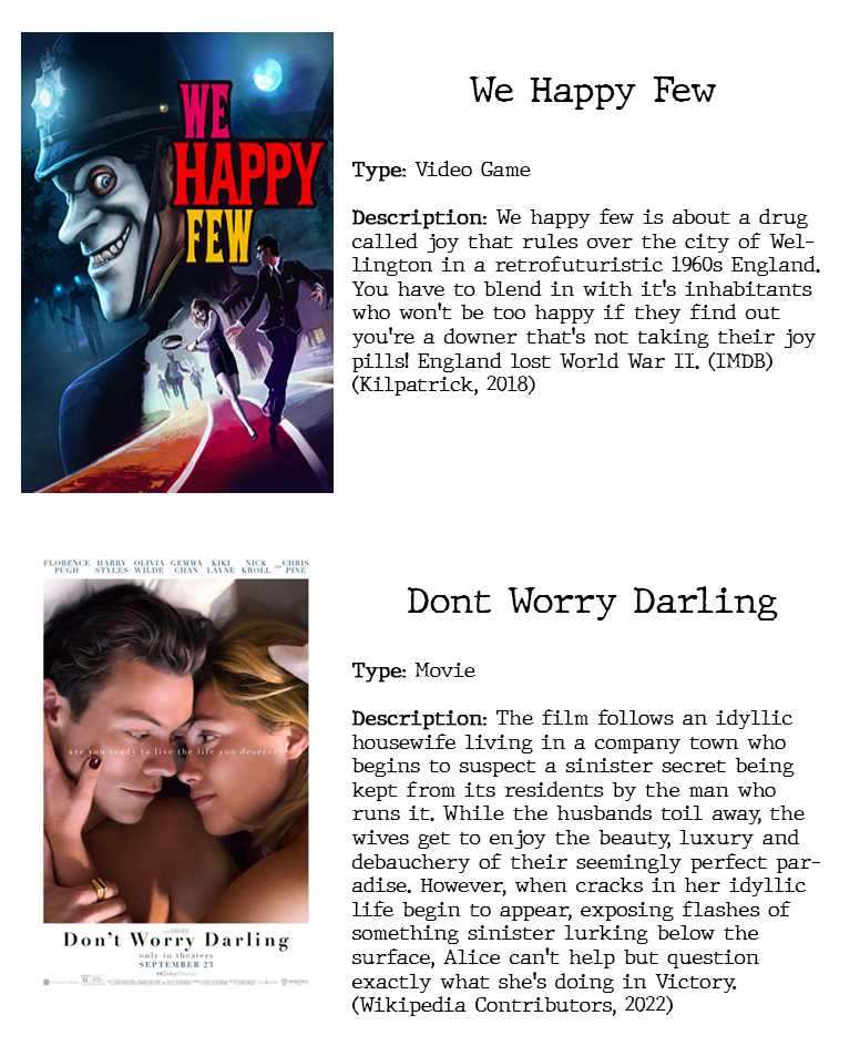 Kilpatrick, A. (2018) We Happy Few (Video Game 2018) – IMDb. IMDb. Available online: https://www.imdb.com/title/tt5031802/plotsummary [Accessed 10 Nov. 2022].