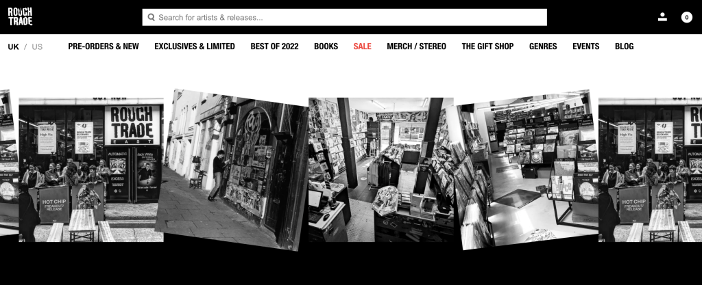 When looking at Rough Trade’s website, their is definitely aspects of brutalist graphic design used, whether this is intentional or not. For example the spacing and positioning of the album covers are slightly unorganised with is a method often used within the movement. In addition, the colour scheme used is very monotone, which although not exclusive, it is also a method that many designers gravitate towards within websites and other forms of media within the brutalist graphic design theme.