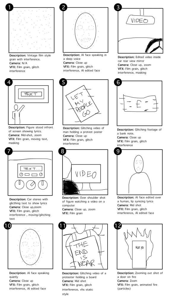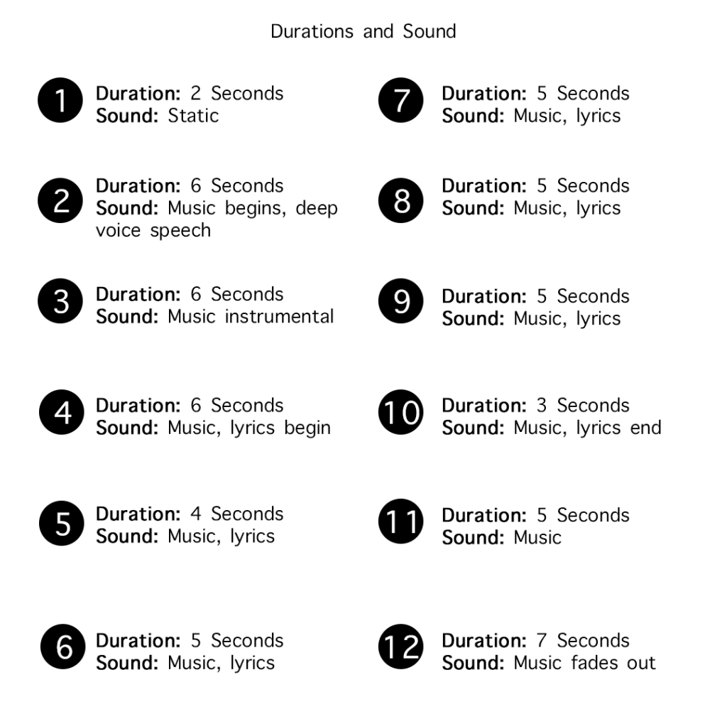In addition to the storyboard, I have also listed a rough guide on durations for each scene. As my piece is roughly 60 seconds, it gives each scene an average of 5 seconds for content, however some scenes need longer and some need less such as the opening scene. During filming and editing, these time values may change but it’s good to have a rough plan to stick to. Furthermore I have listed what sounds would be included in those scenes. Since I am creating a music video, the majority of the sound would be music, however the intro and towards the end will include speech and static.