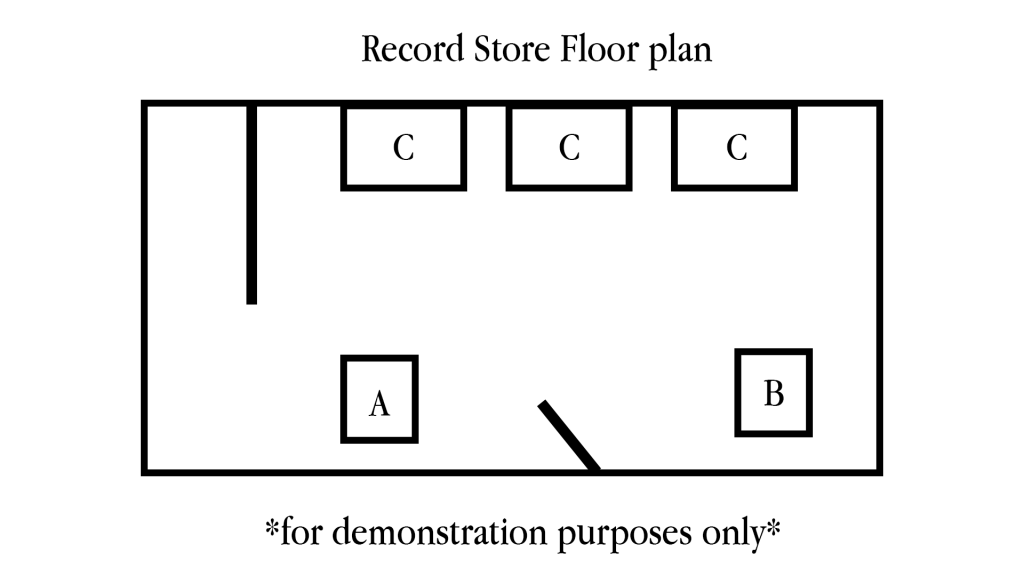 Before 3D modelling the store, I would create a detail floor plan that would detail the locations of each asset. This is good to see a rough layout of how the shop would look before any physical planning begun. In Figure 8, I have created a very simple layout to demonstrate how I would initially plan the store and have labelled each asset with a letter that would correspond with an asset, such as a record box.