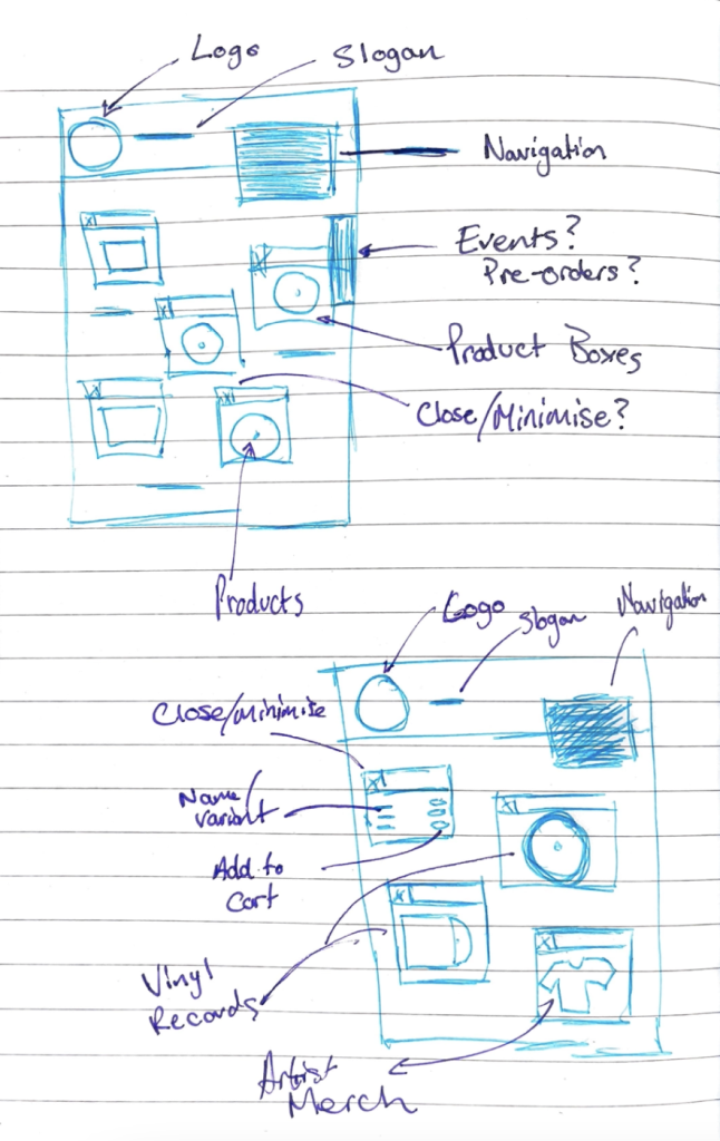 As this is a record store concept, I need to include a page dedicated to individual products, as well as one to house a selection of these records for people to browse and then purchase. My initial idea is to display a selection of my own designed albums, directly on the landing page of the website. The user would then be able to click the album cover and be directed to an entire product page where they can see further images and options to purchase.