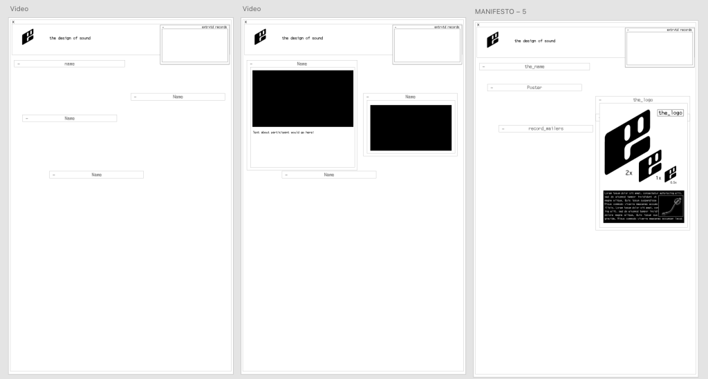 Furthermore, I used the exact same design layout for the ‘design manifesto’ page. This is a hidden page which displays a range of design elements from information about the brand identity of extrvtd, as well as advertising posters. The premise of this design manifesto is to offer some clarity on why the brand is designed the way it is, and help users understand brutalism in a unique way. This page displays these assets through the expandable menus that were developed within the videos page. To demonstrate how these images are displayed, I have begun to include some of the design manifesto assets I created after my research in trimester 1.