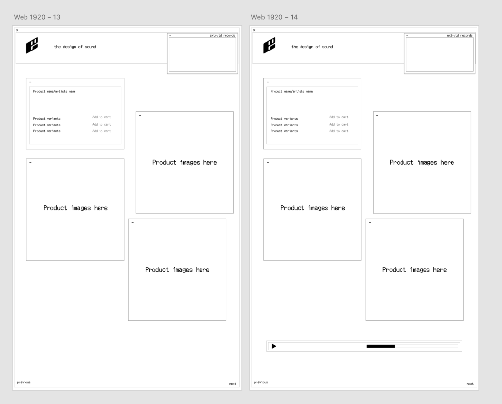 Once the homepage was designed, I used this layout as the basis for pages going forward. The next page to be developed was the individual product pages which is where the vinyl records and merchandise would be displayed, ready for customers to purchase.