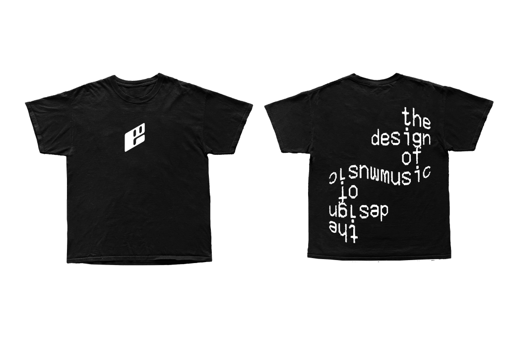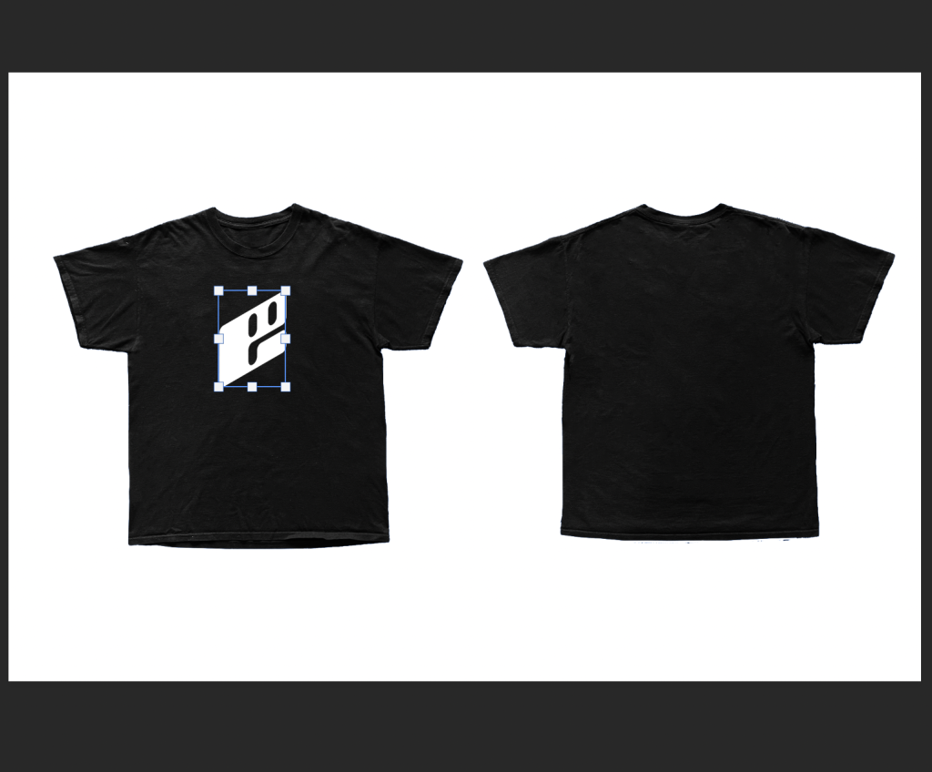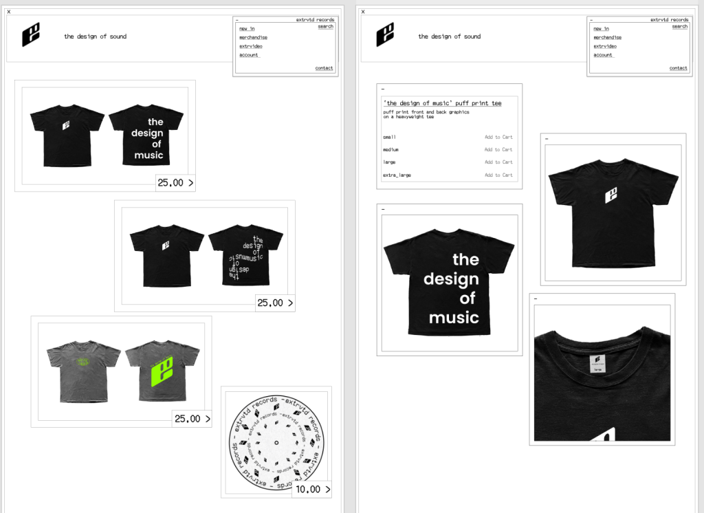 I begun with a simple logo t-shirt which features the extrvtd logo, as well as the slogan ‘the design of sound’ which is used in the header of the website. I felt this style fit the overall theme of extrvtd and especially the website which the black and white colour scheme, as well the continued use of my chosen font.