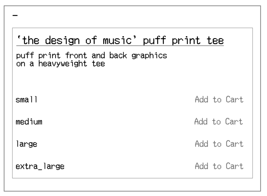 Similarly to the music products, the merchandise follows the same option selection window, this time with sizes for the t-shirts. It also includes a small description about the t-shirt and its print style.